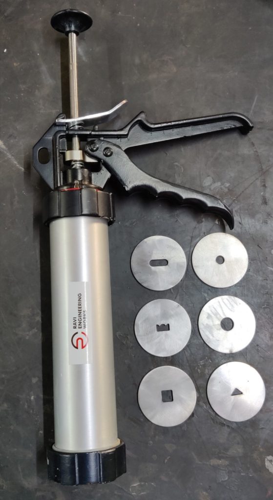 An exceptionally handy, rugged handheld extruder for making small runs of a particular form. We’re sure you’ll find many uses for this handy tool in your studio or classroom. The clay gun comes with 6 dies to customize to your own needs. The barrel is 9″ long and has a 2″ diameter.